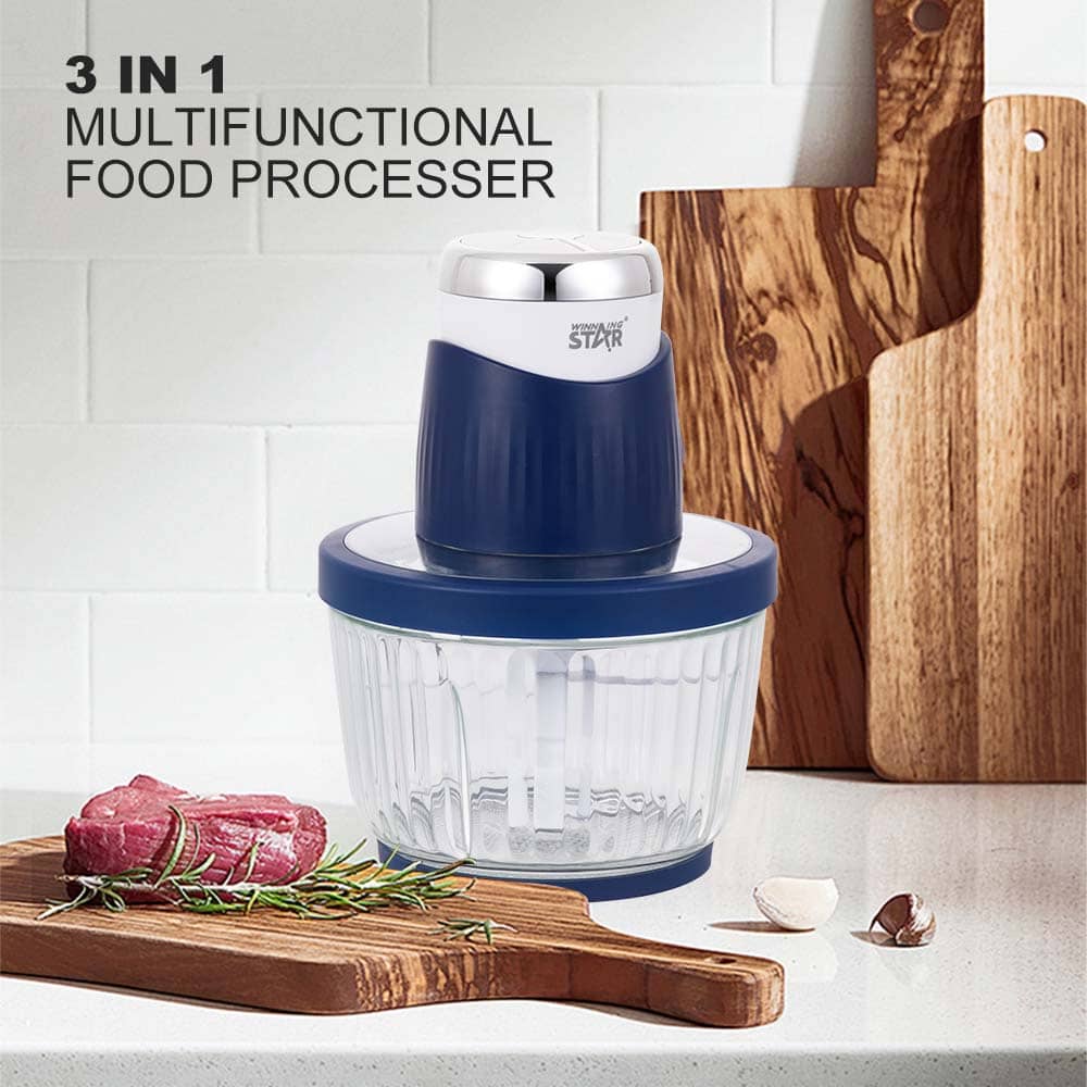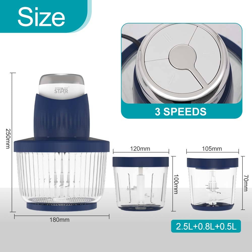 خلاصهٔ کوتاه: دستگاه چندکارهٔ 3-in-1 با توان ~300 W که بهصورت پک سه ظرف/کاسه با ظرفیتهای مختلف عرضه میشود (مثلاً کاسههای 2.5L، 0.8L و 0.5L) — هدفش پوشش دادن کارهای خردکن، مخلوطکن/همزن و شاید چرخگوشت سبک است. مناسب خانوادههایی که میخواهند با یک دستگاه چند اندازه مختلف را داشته باشند.