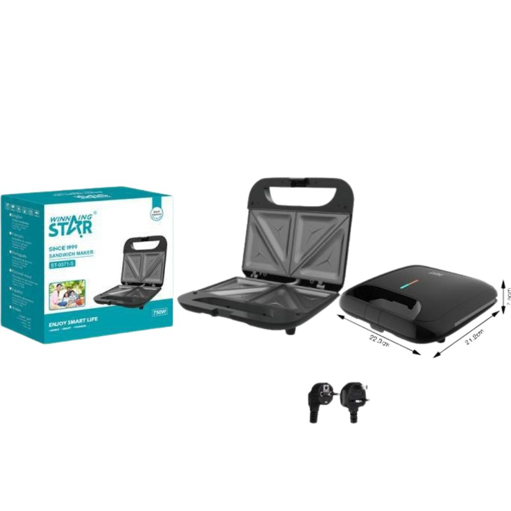 خلاصه: مدل جمع‌وجور وینینگ‌استار با توان حدود ۷۵۰ وات، صفحات آلومینیومی با پوشش نچسب و نشانگرهای روشن/آماده‌به‌کار — مناسب ساندویچ‌های مثلثی/تستی برای ۱–۲ نفر و استفادهٔ روزمره